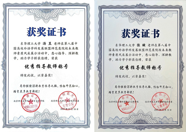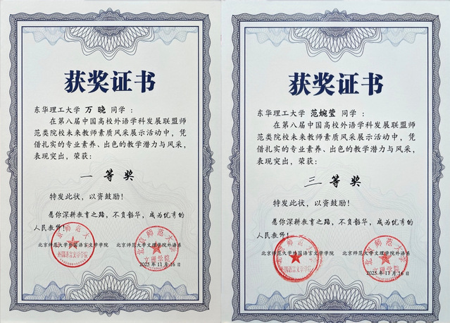 11月15日至16日,第八届中国高校外语学科发展联盟师范类院校未来教师素质风采展示活动在北京师范大学(珠海校区)圆满落幕。东华理工大学外国语言与国际传播学院学生万晓(指导老师汤昱)荣获一等奖、范婉莹(指导老师张璇)荣获三等奖。