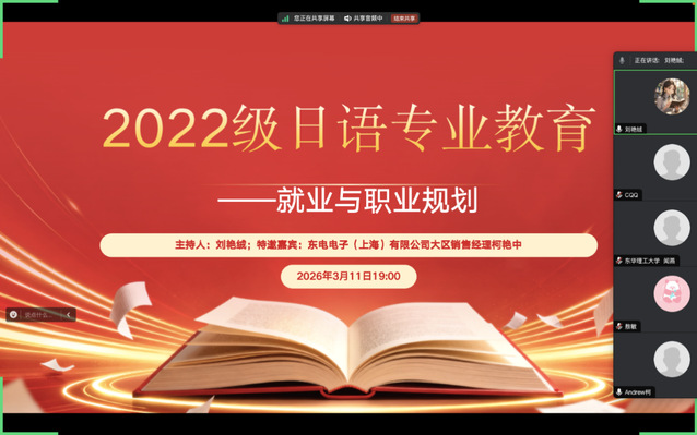 为助力学生明晰就业形势、提升职业规划能力,3月11日晚,东华理工大学外国语言与国际传播学院日语系特邀2012级优秀毕业生柯艳中,通过线上平台开展了主题为“就业与职业规划”讲座。