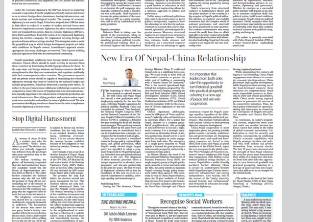 近日,尼泊尔研究中心负责人刘悦明教授在尼泊尔官方主流英文媒体《新兴尼泊尔报》上发表题为“New Era Of Nepal-China Relationship”文章。这是继其在“The Annapurna Express”刊发文章后,再次在海外权威平台发声。